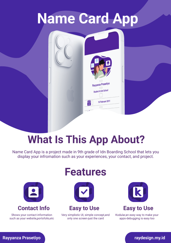 Hello there everyone! Wow, time has passed quickly, and I am now sitting in the last grade of Junior High – which is 9th grade. And this time around, the projects for 9th grade is about making applications. And, I have a new project to show to you which is the Name Card App!